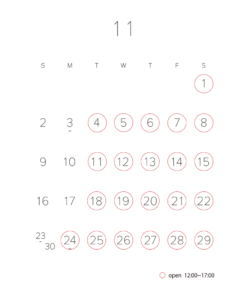 直営店 carmine design factory!の2025年11月の営業日です。 営業時間は12:00〜
