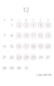 直営店 carmine design factory!の2025年12月の営業日です。 営業時間は12:00〜