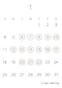 直営店 carmine design factory!の2026年1月の営業日です。 営業時間は12:00〜1